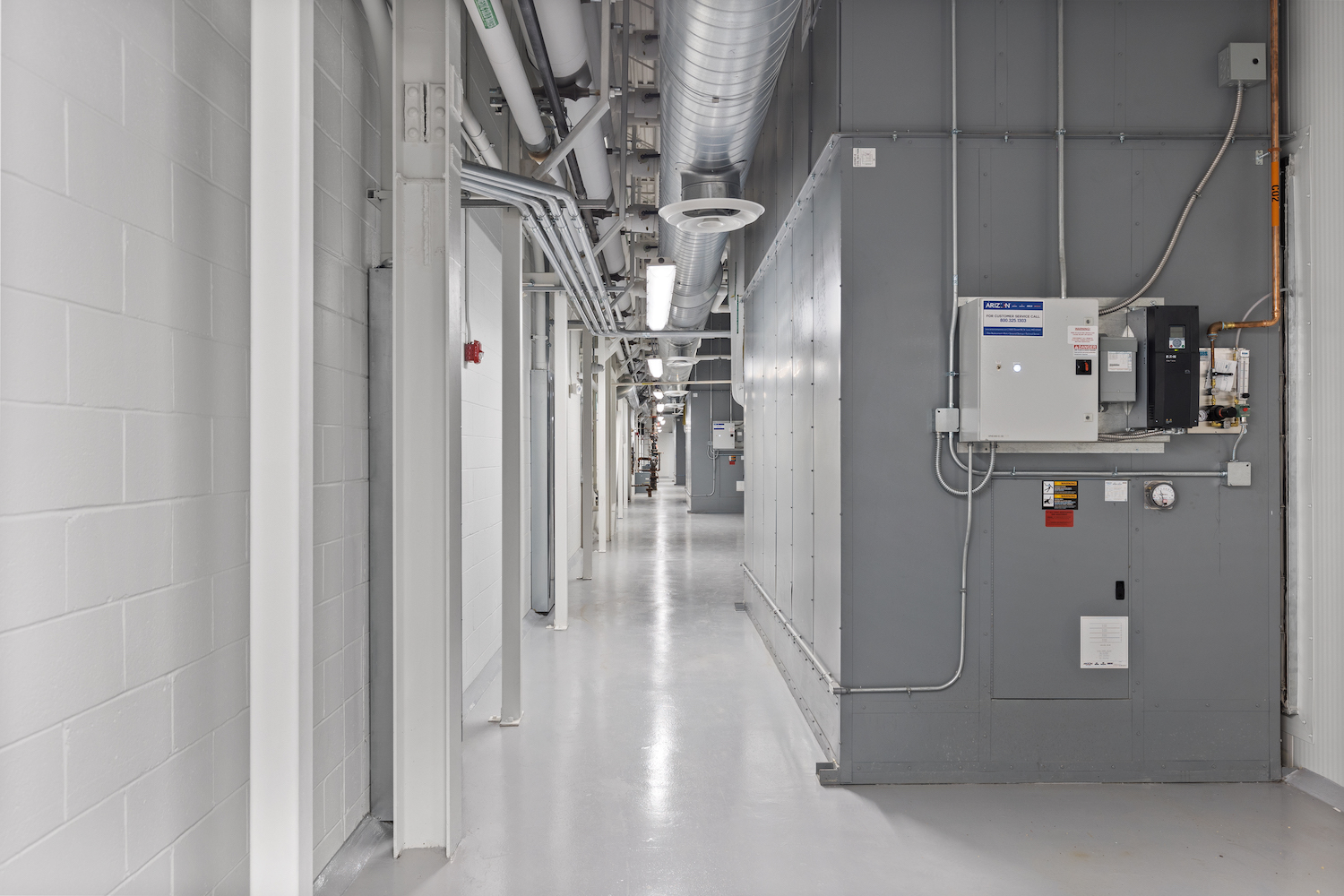 The project included the installation of all new MEP/FP (mechanical, electrical, plumbing and fire protection) and HVAC infrastructure to meet the heavy systems demands of the cultivation facility. The building required a new electrical service power upgrade, including new outdoor switchgear with a CAT diesel backup generator. The main chiller plant features three Tecogen chillers, boilers and two large cooling towers that supply hot and cold-water loops for the building’s HVAC needs. The chiller plant consists of four modular sections that were assembled in Arizona, shipped to Millbury and very carefully installed on a new, custom-built structural equipment pad.