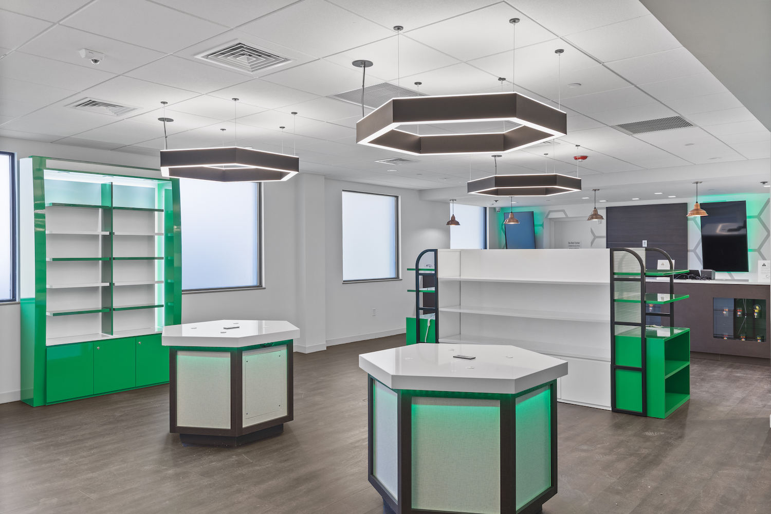 GCC’s high-end dispensary features distinct branding, including an eye-catching honeycomb design element. The space is well-lit and inviting, with a layout that helps customers find the products they need and get the help they want, without feeling hurried. The dispensary will offer flower, edibles, concentrates, tinctures, topicals and more.